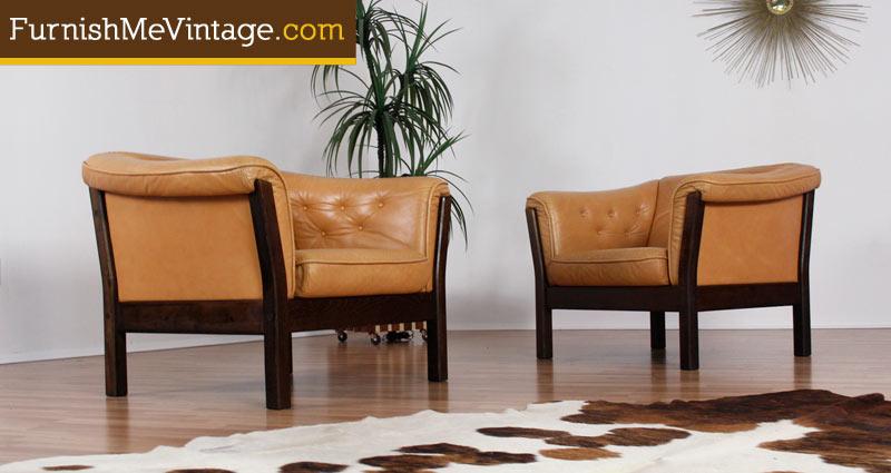 Pair of modern leather club chairs. Button tufted, butterscotch color, authentic leather upholstery. Dark mocha solid wood frame. These chairs look to be contemporary, not vintage.