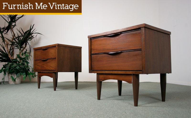 2 Drawers provide plenty of storage in these retro Danish style nightstands. Scandinavian style carved lips act as the handles to the deep and wide drawers. Atomic age, pencil tapered legs add to their vintage charm. Very practical, walnut wood patterned Formica (laminate tops). No worries about spilling your bed-side glass of water. Just wipe up any spills without damaging the surfaces, as with a wood nightstand.