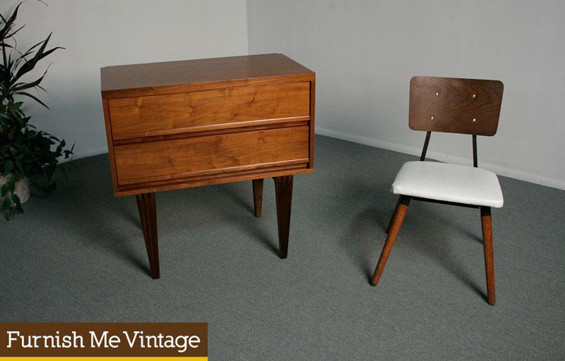 Petite vintage chest of drawers. Walnut wood construction with minimalist, hardware free front edifice. Sculpted wood pulls on the bottom edge of the drawers act as pulls. Scandinavian look, with American craftsmanship. Metal glides on the drawers allow them to slide out effortlessly. Unusual, architectural legs with exposed tongue and groove joinery serving as a decorative element. Use in the bedroom as a dresser, storage in the office or as an large nightstand. This piece looks smaller in the photos than it is in real life, please take note of the dimensions below.