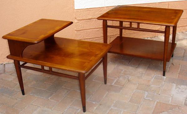 Classic mid century modern 1960s pair of end tables by Lane, from the Acclaim Dovetail series. Lane started the “Acclaim” line in 1959 and it was the best selling line of furniture in 1963. Made of walnut and contrasting maple. These lovely tables feature 2 tiers, tapered legs and fabulous wood grains. The large dovetails measure 2 1/2″ wide. Stamped on the bottom. Very good vintage condition.
