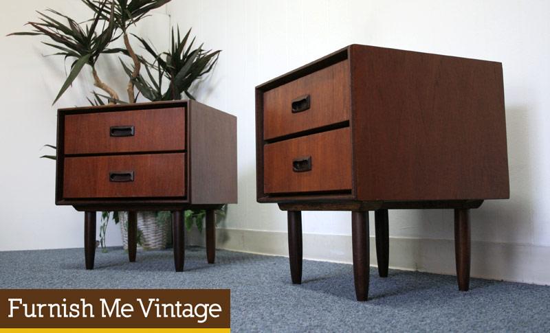 Mid Century Modern circa 1960s Danish style nightstands. Petit in size but not lacking in stature. This handsome pair of end tables exudes style. Classic, clean Scandinavian lines. Teak wood construction with darker Bangkok teak trim along the front perimeter. Solid Bangkok teak pulls add an air of elegance. Two spacious drawers provide ample, private storage.
