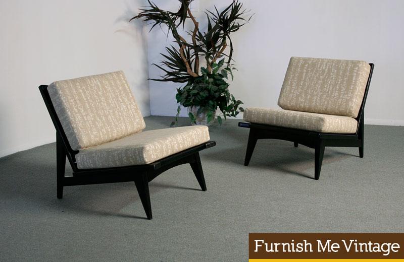 Super stylish set of two retro 1950s era vintage slipper lounge chairs. Very low slung with a sexy angled profile. Slatted backs add a striking contrast against the neutral beige and ivory specked fabric. There chairs are unmarked, but they look to be designer. Pointed tips on the back rest and front seat area suggest maybe an Italian origin. These pointed tips have also been seen on works by American luminary, Paul McCobb. Totally rehabbed with a fresh coat of black paint, professionally executed upholstery with high grade fabric. All new webbing supports beneath the seat cushions.