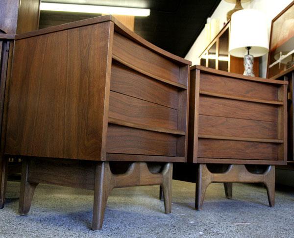 Matching pair of Mid Century Modern vintage nightstands. Super clean top surfaces. Distinctively retro styling with lateral sculpted detail across the front surfaces that act as the drawer pulls. Two spacious drawers. We have a huge mirror, giant triple dresser and armoire that match these nightstands.