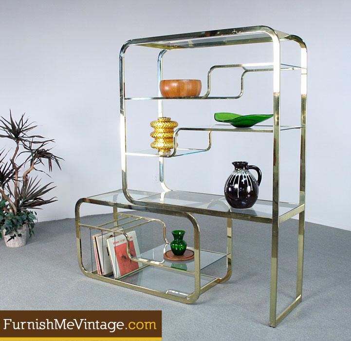 Magnificent Post-Modern gold colored 2-Piece etagere. Modular and adjustable to suit your needs. Lower portion features dividers for storing records, books or magazines. Upper portion has several glass shelves for displaying your collections or photographs. Slide the lower portion underneath the top completely. Otherwise slide it outward incrementally as desired. Arrange the lower half asymmetrically to accent a window. Use the lower portion as a stereo stand. Place the turntable on top and records below. Gleaming gold surface adds such glamour to a space. You’ll be hard pressed not to fall in love every time you lay eyes on this piece. A perfect addition to your Milo Baughman, Mastercraft, Pace Collection or Karl Springer influenced decor.