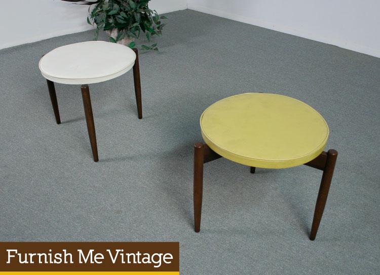 Fun Atomic Age character to this pair of Mid Century Modern stools. Topped with their original high quality vinyl. One stool is white, the other is a fabulous olive green — exemplary of the period. Each 1″ thick pad rests on top of a tri-leg solid wood base. Legs have sleek, tapered, Danish inspired styling. Perfect for use as additional seating, foot stools or end tables. These would even make a great napping station for a small pet. Easy to maintain vinyl. Just wipe away fur or spills.