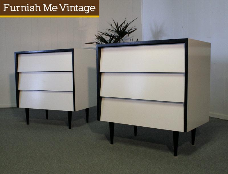 Matching pair of two black and white small vintage Mid Century Modern dressers. Place them side by side to form one large dresser or use them individually. Each commode chest has three wide drawers. White laminate surface is durable and easy to maintain. Designed in the manner of Florence Knolls famous Number 125 dresser. This ultra mod look works well in a retro or contemporary home.