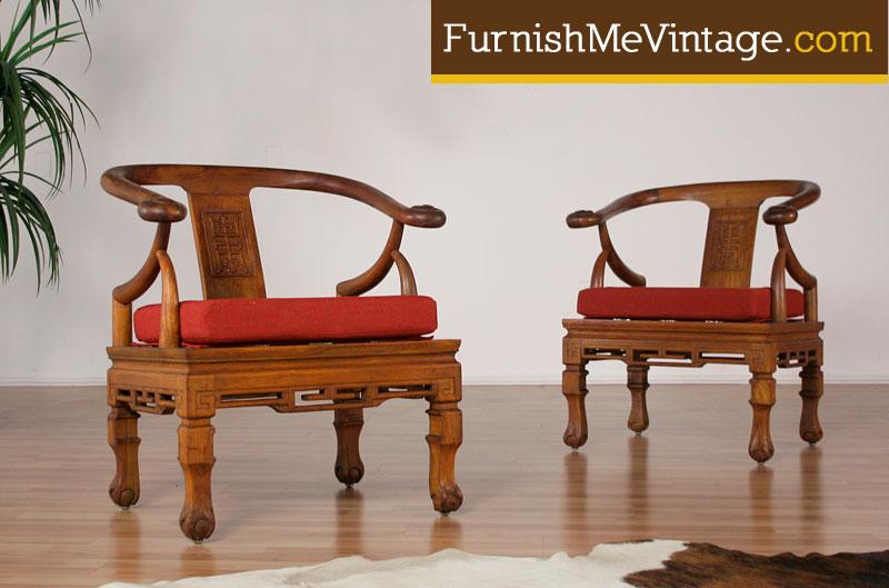 Pair of solid teak carved Chinese Ming chairs. Elegant oxbow shaped back rest with spiritual insignias sculpted into the back rests. Newly upholstered seats and new cushions foam. All new webbing support straps beneath the cushions. Beautifully restored by our team. Stately chairs that would blend well with contemporary or James Mont or Edward Wormley themed Mid Century Modern decor. Distinguishing characteristics include ornately scrolled arms, carved apron and claw shaped feet. Compliment these chairs with our large Asian coffee table (sold separately).