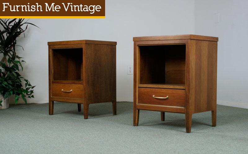 Pair of unusually tall retro nightstands. Each side table features a large cabinet space and single drawer toward the bottom. Medium walnut tone wood. Ideal for those with high beds. If you need tall nightstands, grab these while you can… this size is rare.