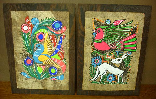 1960s era Amate Bark Paintings from Guerrero, Mexico. Mythological scenes painted on amatl, the sacred paper of the pre-Hispanic peoples of Mexico. Mounted on dark wood. Brilliant colors. In excellent vintage condition. These pieces really POP. Authentic Mexican folk art.
