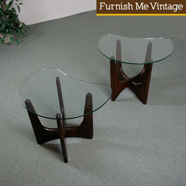 Kagan / Pearsall style Mid Century Modern end tables with boomerang glass tops. Dark, reddish tone wood bases — likely rosewood or mahogany. Great sculpted look to the 4-pronged bases. Glass rests on the tips of these four tiers. Joints on the bases have been tightened so ensure sturdiness. Durable 3/8″ thick tempered glass serve as the table tops. Lovely marriage of atomic age and high-end retro style.