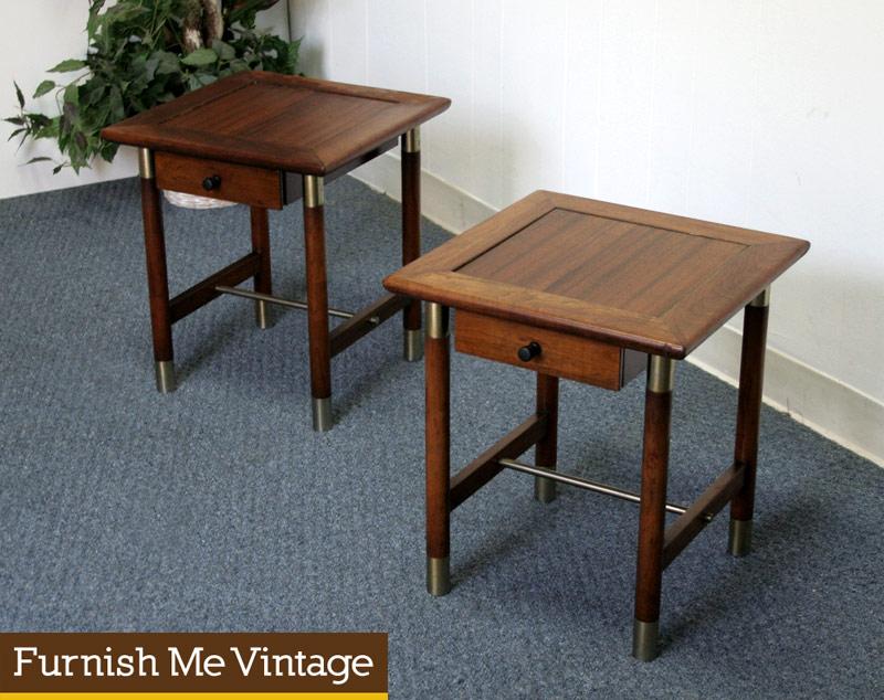 Pair of very small Weiman “Heirloom Quality” (as stamped underneath) end tables. Use these small side tables as nightstands in the bedroom or end tables in the living room. Each table features a drawer for private storage. Likely produced in the 1950s, walnut wood construction embellished with brass hardware on the legs. A Paul McCobb like brass rod lends further support to the bottom stretcher. These tables are a mix of Modern and traditional with the unmistakable quality found in retro American furniture design. The tables backs are finished as well.
