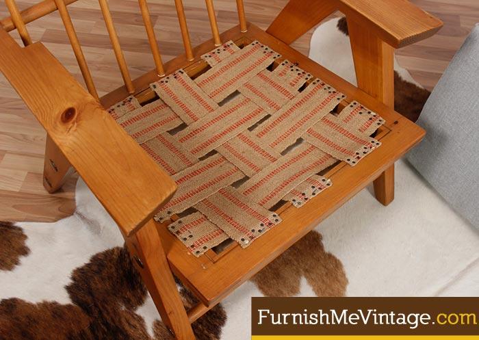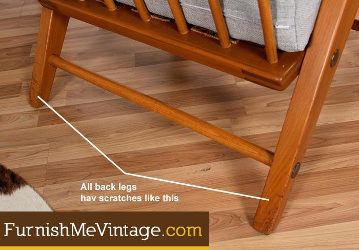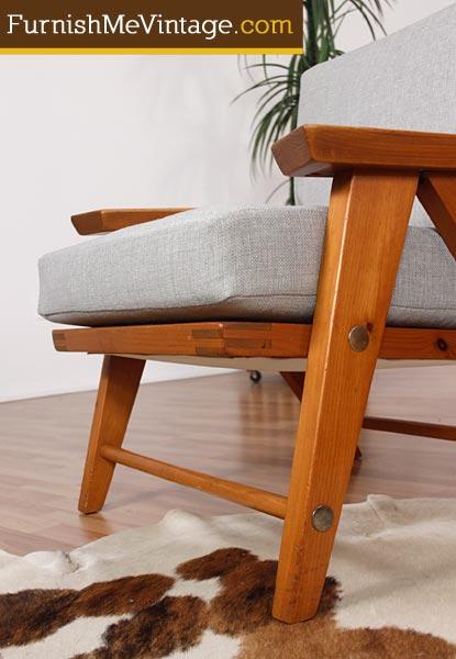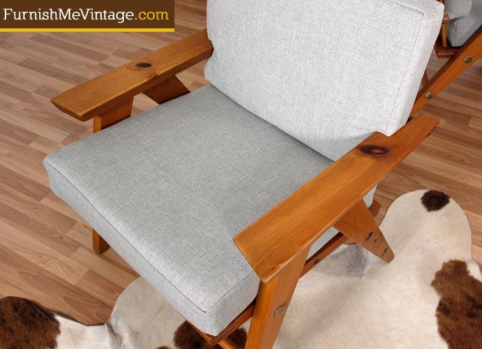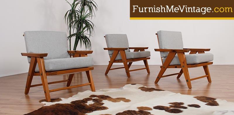 Three matching mid century modern lounge chairs. Solid pine wood construction. New light gray tweed style upholstery. Thick cushions provide ample comfort. Be sure to take a look at all the photos. These chairs are simply stunning. Surprises revealed at every vantage point. Strong architectural, angled legs accented with gold colored buttons. Arms are wedge shaped broadening from rear to front. Back cushions are notched into the wedge arms. Back side reveals spindle design borrowed from traditional furniture design. Stout construction sure to last many more years.