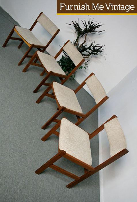 In good vintage condition with some subtle stains on the upholstery. One chair has had a bottom span replaced... it's a different color than the rest of teak frame.