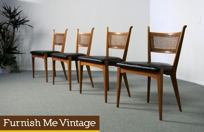 Charming set of four Mid Century Modern 1950s era retro dining chairs. Designed by American Edmund J. Spence, in Sweden for Walpole Furniture. Petite, yet sturdy and very stylish. Note the dynamic angles on the back rest and legs. Very Scandinavian inspired design with the durability of birch wood construction. The seats have all been professionally reupholstered in high quality black vinyl. Easy to maintain fabric for the seats, if you spill something, simply wipe it away. Caning on the back upper area is all intact and in great condition. These chairs are in beautiful shape with no substantial wear. Minor age appropriate wear includes a few typical scrapes on the legs. These chairs sell for thousands on 1st Dibs. Grab them while you can at this amazing price.