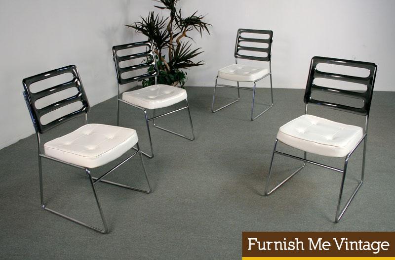 Vintage post-modern chrome and Lucite dining chairs. White vinyl seats with button tufts are easy to maintain. Wipe away any spills. Smoked, charcoal gray color on the thick acrylic seat backs. Very clean chrome, vinyl and plastic. A fresh contrast against the typical wood heavy design schemes of Mid Century Modern furniture. These chairs could also work with contemporary interiors. Pair this group with our amber tulip table (sold separately).