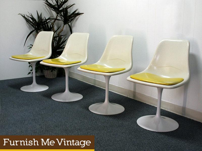 Complete set of four vintage 1960s era Mid Century Modern tulip chairs. These fiberglass shell chairs rest on a thin-stemmed pedestal base design made famous by Eero Saarinen. Newly repainted, gleaming white bases, give this set a fresh feel. Make this iconic set of dining chairs a centerpiece in your retro decor.
