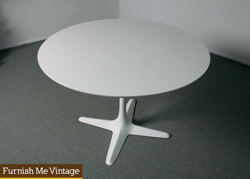 Iconic Mid Century Modern vintage tulip dining table. White laminate top with a sturdy aluminum base. Refinished with fresh white paint on the four-star metal base and table top perimeter. Top surface is very clean with no major faults. Modeled after the design made famous by Eero Saarinen. We have four tulip chairs that would match well with this table (sold separately).