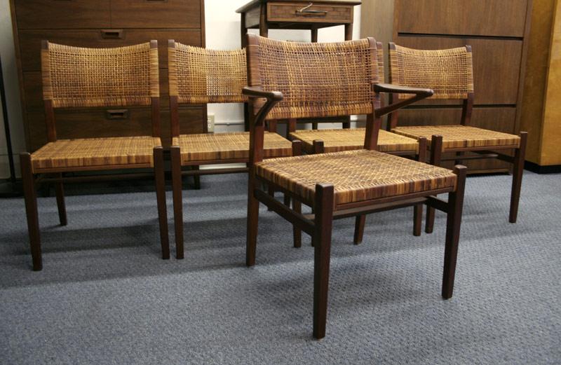 Set of five vintage Mid Century Modern teak dining chairs imported to America between in the early 1950s by an U.S. government employee. These chairs feature caned seats and back rests woven over a Danish teak wood frame. Designer quality, no maker’s mark. The set includes one super stylish arm chair. Fine example of retro Scandinavian design. Priced accordingly.