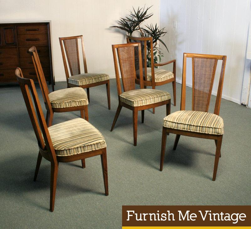 Six Vintage Mid Century Modern ??Panorama? dining chairs by Drexel. Danish style angular construction with caned accent on the back rests. The set consists of one arm chair five armless mates. Striking architectural profile. Note the angular, Scandinavian inspired back legs. The 1960s era funky velvet upholstery is in excellent shape. The seats unscrew for easy DIY reupholstering if the fabric is not to your taste. These chairs are in fantastic vintage condition with no notable wear.