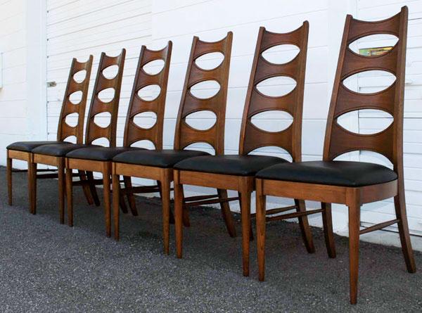 6 Mid Century Modern Walnut & Black Vinyl Dining Chairs