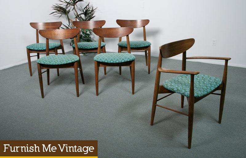 Set of six solid walnut American made Mid Century Modern retro dining chairs. Inspired by Peter Hvidt’s famous designs. The wide seat and bowed back provide maximum convert over most chairs of this vintage. This set consists of 5 armless side chairs and one captain’s arm chair. The turquoise colored funky retro fabric on the seats lends added charm. Don’t like the fabric? Unscrew the seats for easy DIY reupholstering. Excellent vintage condition — only minimal age appropriate wear on the wood frames.