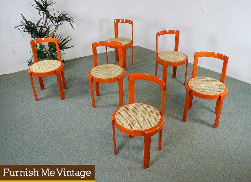 Set of 6 funky Mid Century 1970s orange stained dining chairs. These chairs are not painted… they’re they’ve been outfitted in a high-key orange stain. Cream colored caning provides acts as the seat support. Dainty and playful, but surprisingly sturdy. These chairs came from the home of a sizable man. He used them, along with his wife and two children, for decades. Caning is all intact, two seats have new, professionally restored caned seats that match the original chairs. All of the chairs have some wear on the wood frames, peppered throughout. These abrasions on the orange finish can best be described as character marks, endearing their vintage look.