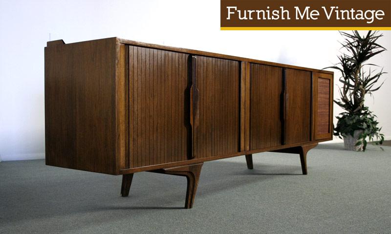 This is the trifecta of perfection in terms of Mid Century Modern credenzas. It’s ultra long, very low, sleek Danish styling with the durability of American craftsmanship. Huge amount of storage here with wide ample cabinet spaces with adjustable height shelves. The center of the server features a single drawer up top. Sturdy walnut wood constructions with tambour doors and caning on the far right door front. Do not miss your opportunity to own this uncommon piece of atomic age furniture.