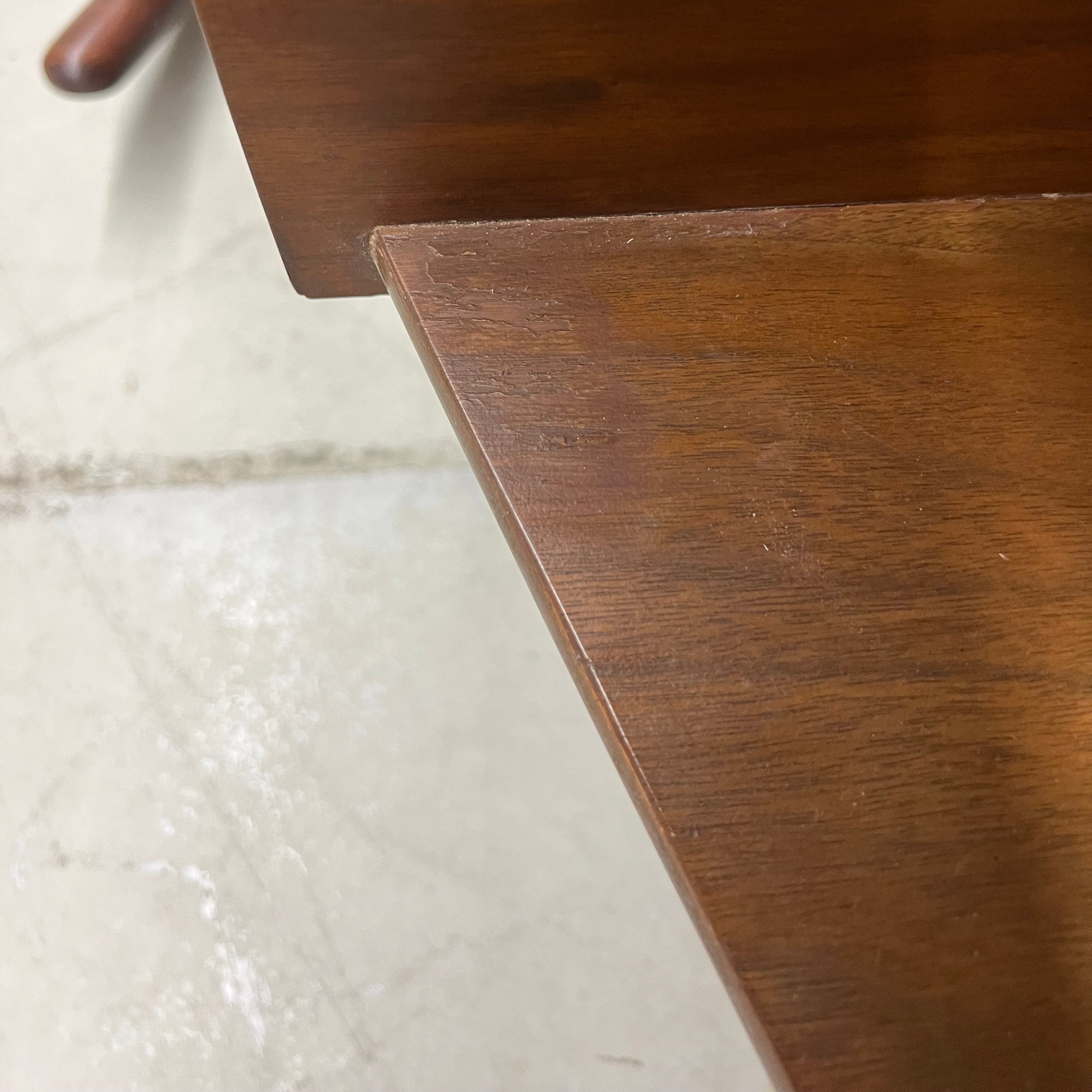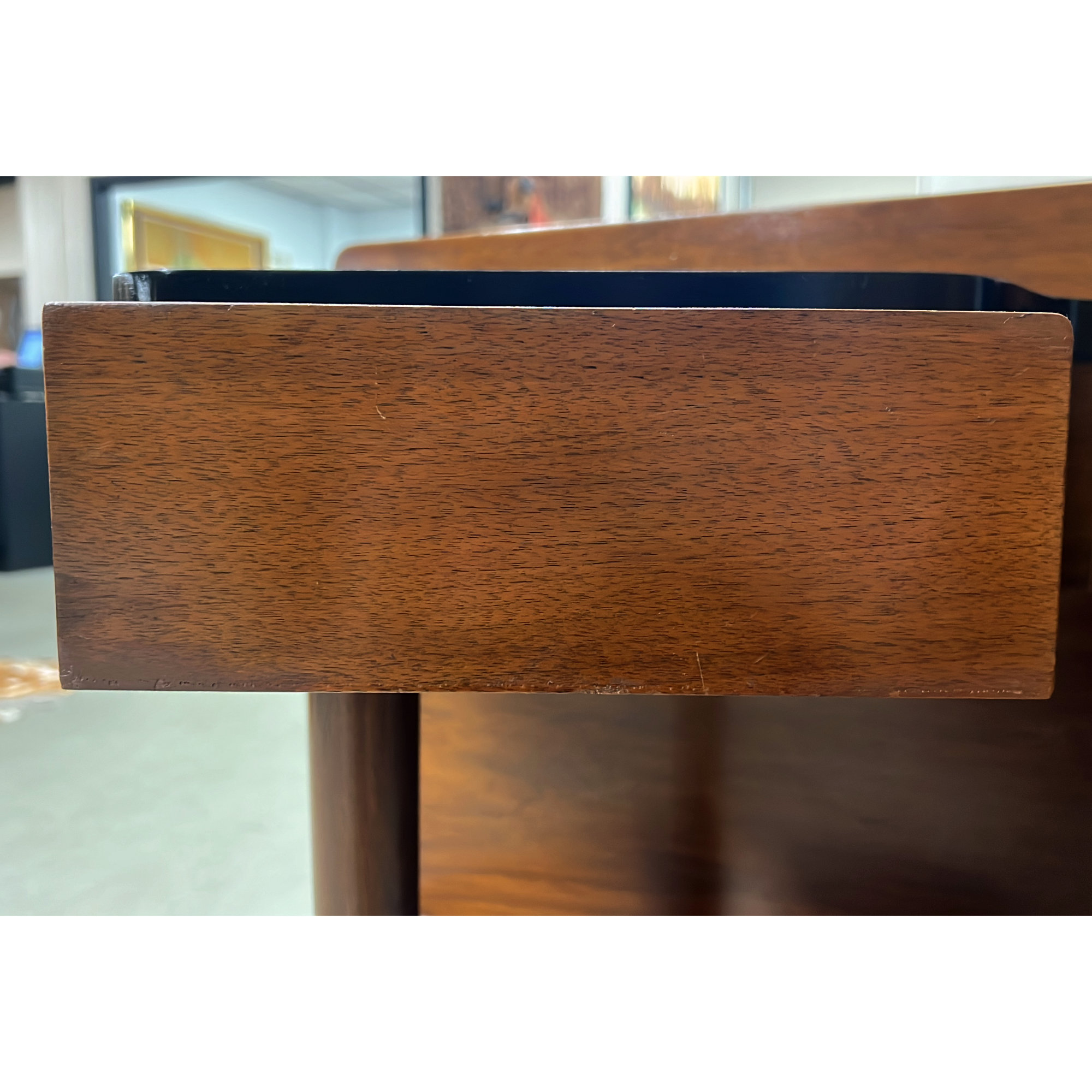 Mid-Century Modern American of Martinsville’s Dania 4004-14 “Bar Bed” headboard with built-in nightstands. Designed by Merton Gershun, this walnut bed headboard sports a pair of sleek built-in nightstands. The nightstands are seamlessly joined to the main body of the headboard – so discreet, one may not even notice them.