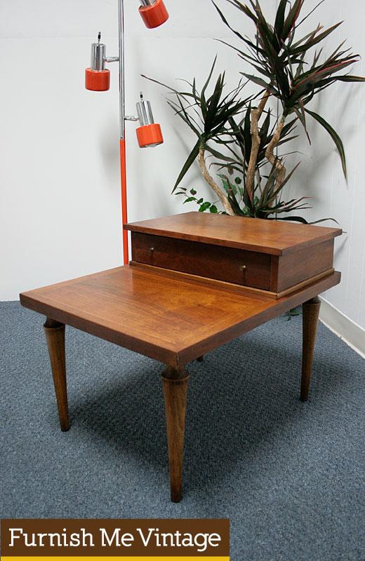 Walnut side table by American of Martinsville circa 1950s. Straight line, clean, profile with original hardware on the upper drawer. A lovely, practical piece from one of the most revered American atomic era furniture manufacturers. Stamped “American of Martinsville” on the drawer interior. Dovetail joinery on the drawer. The legs feature a gentle carved embellishment toward the top.
