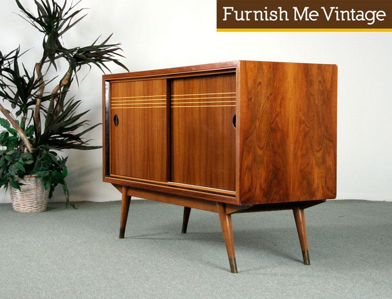 One of the finest Mid Century Modern pieces Furnish Me Vintage has had the pleasure to offer. This retro German ƒ??Rockabillyƒ? sideboard is a showstopper. Produced by Nussberg Mobler of Germany, circa early 1950s. Itƒ??s no wonder that the nation that brought us Bauhaus also created this atomic age masterpiece. In Germany, they call this style ƒ??Rockabilly.ƒ? A fitting moniker conjuring images of Graceland and Jerry Lee Lewisƒ?? home in the minds of Americans. Lots of practical storage in the wide open cabinet space. No drawers to fuss with — just a single adjustable height shelf in both the left and right cabinet spaces. Ideal for use of an entertainment center. Make this heirloom quality European cabinet the cherry on top your 20th Century furniture collection. We also have a matching large sideboard wall unit.