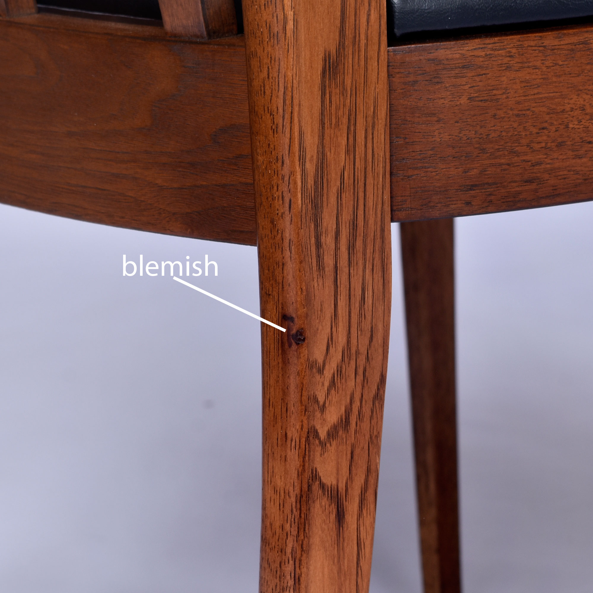 The chairs and table have been delicately refinished to beautiful condition by our in-house restoration team. These chairs saw typical use over the years so the frames will still exhibit a few imperfections. Everything was restored top to bottom and the patina has been preserved on sections when possible. Every seat has been professionally re-foamed and recovered in black faux leather material. The table has been refinished, and only a few minor shadows are left behind from stubborn scratches. The scratches are not detectable to the touch and covered in multiple coats of hand-buffed finish. We’re certain you won’t find a nicer example of this set anywhere.