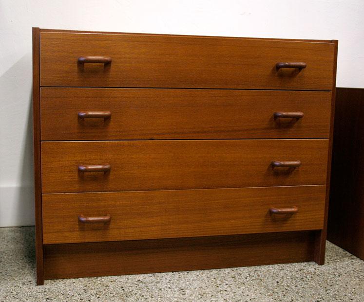 Beautiful Danish Modern teak Bachelor’s dresser size small chest of drawers. Use it as a dresser, an end table, nightstand or extra storage. Made by esteemed Scandinavian furniture producer, Domino Mobler. Stamped “Made in Denmark” with maker’s mark inside of the unit. Four drawers with solid teak pulls. We also have a smaller teak chest of drawers (sold separately).