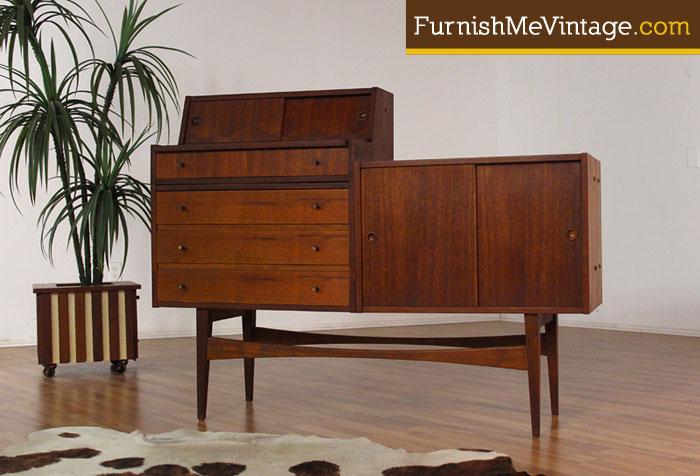 Mid Century Modern Danish teak credenza with secretary. Early piece with deep red patina. Lots of functionality in a compact package. Left side of unit is a secretary with pull out table top and covered storage up top. Four drawers at left and open cabinet space at right provide lots of versatile storage. Back side is finished… ideal for open floor plans.