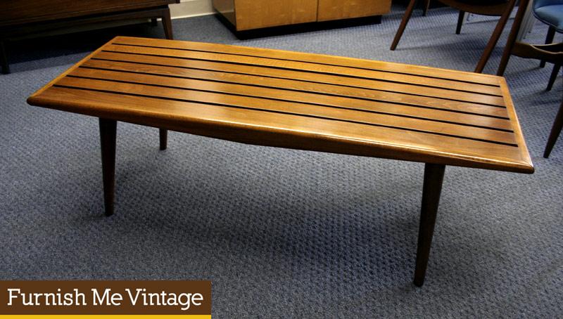 Retro architectural slat bench coffee table with seemingly organically formed rounded edges. Scandinavian style tapered legs, slightly flared out. This piece is in fantastic condition with a super clean top. One of the best examples of a slat table we have seen.