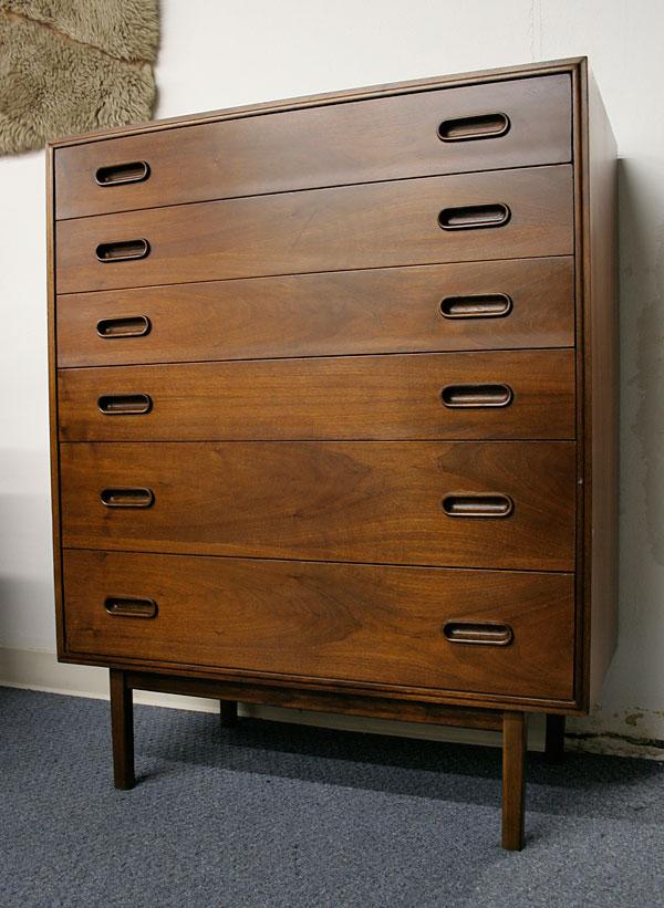 Beautiful wood grain pattern on this American made, Danish style high boy chest of drawers. Large sweeping swirl patterns can be seen in the deep walnut colored wood. Lovely Scandinavian style inset pulls, possibly rosewood. Durable metal rails on the drawer bottoms. The clean lines and simple form translate well to a contemporary aesthetic.