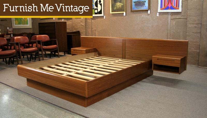 Vintage Danish Mid Century Modern teak queen sized platform bed with floating nightstands. Stamped with the maker’s mark on back “Jesper”. Super clean lines, architectural form. Suits a contemporary design home or retro decor. Brilliant orange hue to the teak wood. Nightstands both have a pull out drawers and clean tops. This bed will come disassembled. Very clean unit with no outstanding wear. Original slats supports in great condition. We have a matching Jesper gentlmen’s chest dresser and several teak chests of drawers that would match nicely to create a complete Danish Modern bedroom set (sold separately).
