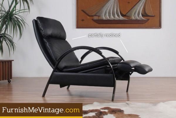 Desing Instute of America ReclinerModern recliner by Design Institute of America. Recently reupholstered in black faux leather upholstery. Material is soft to touch like genuine leather. No sticky, plastic, feel like vinyl. Fabric is cruelty and PVC free. Chair is a true recliner. Foot rest emerges from beneath when reclined. Metal chrome has a reflective smoky black finish.