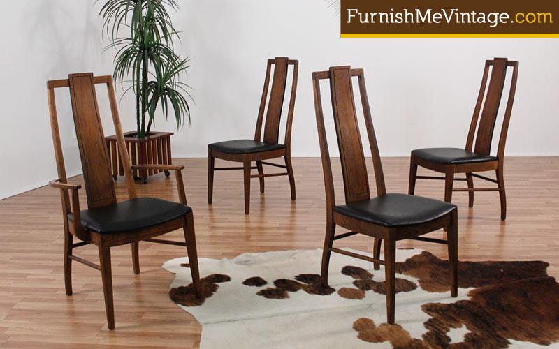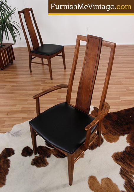 Set of four Mid Century Modern high back dining chairs. Group consists of one arm chair and four armless side chairs. Walnut wood. American made. New high quality black vinyl upholstery on seats. Contoured upper lends ergonomic support to the back. Black pin line accents back rest. Note how the back support band extends beyond the chair frame adding drama.