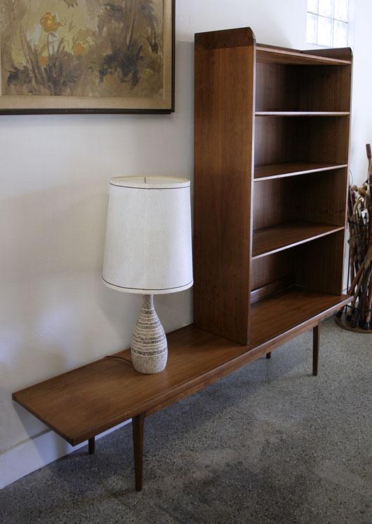 Two-piece shelving unit and bench table combination by Mid Century Modern design luminaries Stewart MacDougall and Kipp Stewart. Produced by American furniture maker Drexel under their Declaration line. This is a super rare, hard to find piece. The unit consists of a bottom bench that could double as a stand alone surfboard style coffee table. On top of this bench rests a freestanding hutch top bookcase with shelving. The hutch top can be positioned anywhere on the bench (left, right or center).