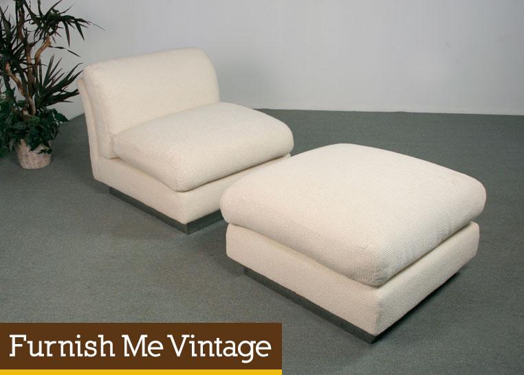 Post Modern plush lounge chair with ottoman. Unmarked, attributed to Dunbar. Ample cushioning make this a super comfortable chair. Paired with a matching ottoman. Resting in this is like having your own personal sofa! Relax with a movie, no problem. Heavy weave, soft, ivory colored fabric is clean! No stains, odors or pet fur. Base is wrapped in a chrome-like metal. Glamorous mirror effect is created on the chair and stool base.