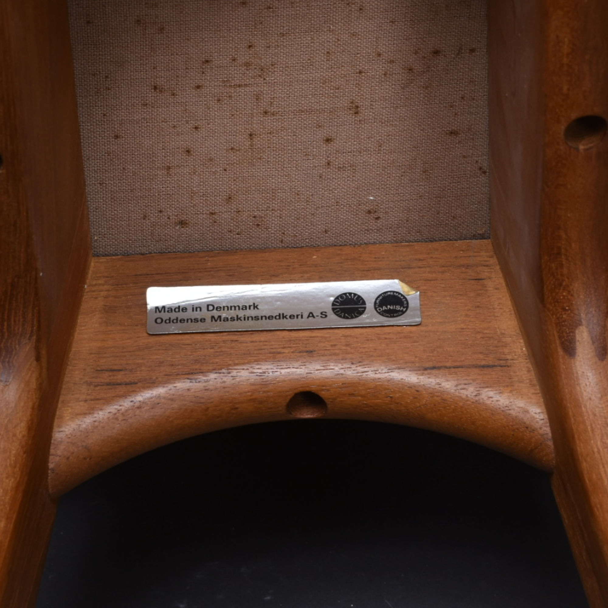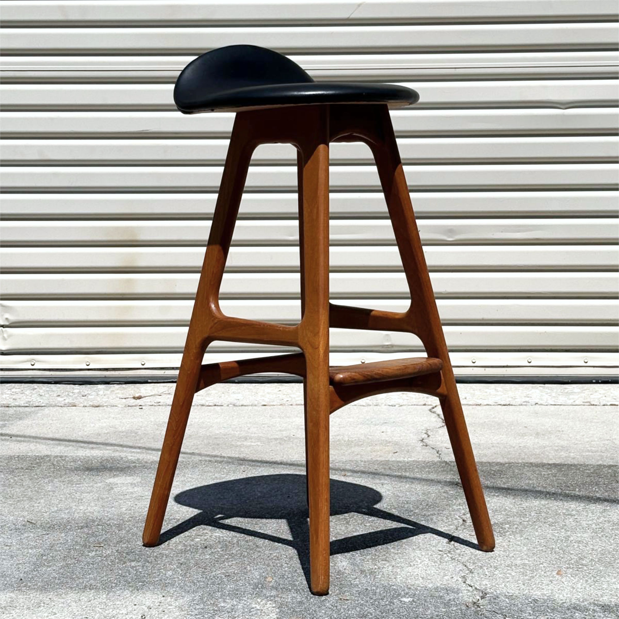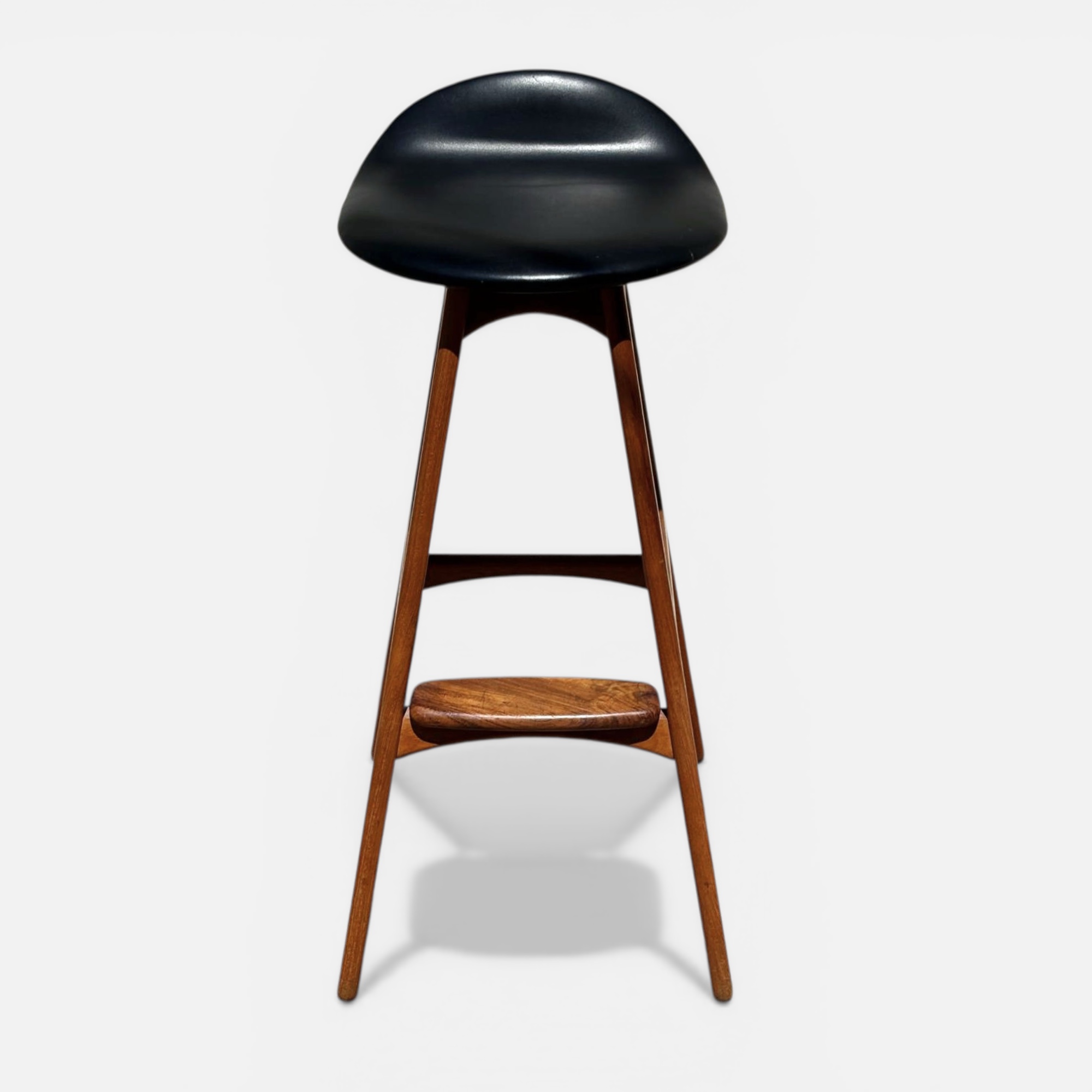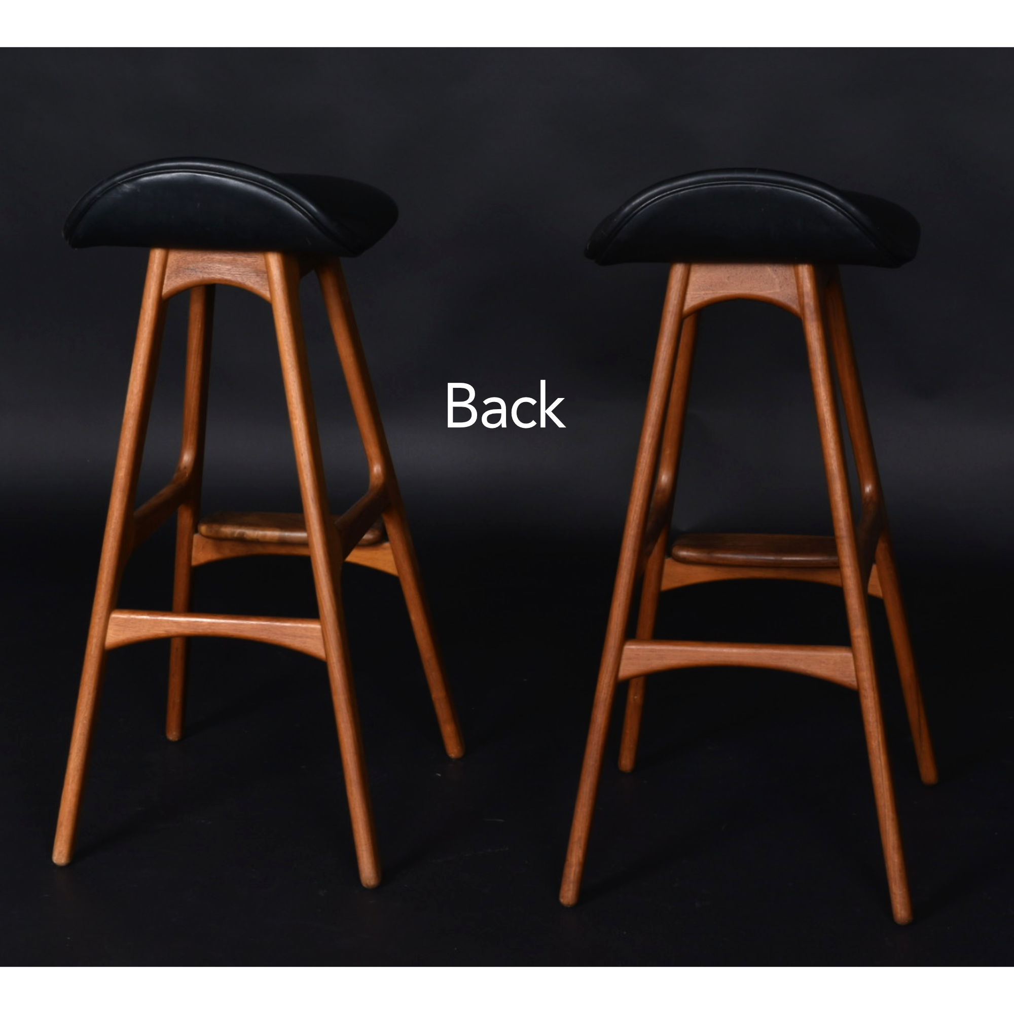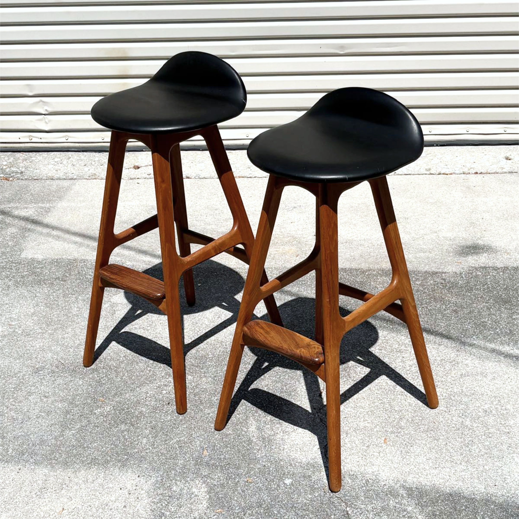 Pair of iconic Erik Buch for Oddense Maskinsnedkeri Danish teak barstools. Collector’s may recognize these barstools as Erik Buck for O.D. Mobler… Oddense Maskinsnedkeri had a name change. Designed in 1961, the solid teak stools remain refreshingly Modern. Pedigree is evidenced with the deep red-orange patina garnered only through time. Over half-a-century later, the forward thinking design still captivates the eyes. The stark black seat handsomely contrasts against the warm teak wood. Comfort is enhanced with the padded seat, foot rest and slight, lip-like back support. The barstools have the Oddense Maskinsnedkeri foil label beneath the seat. Don’t miss this opportunity to add these heirloom Danish pieces to your collection.
