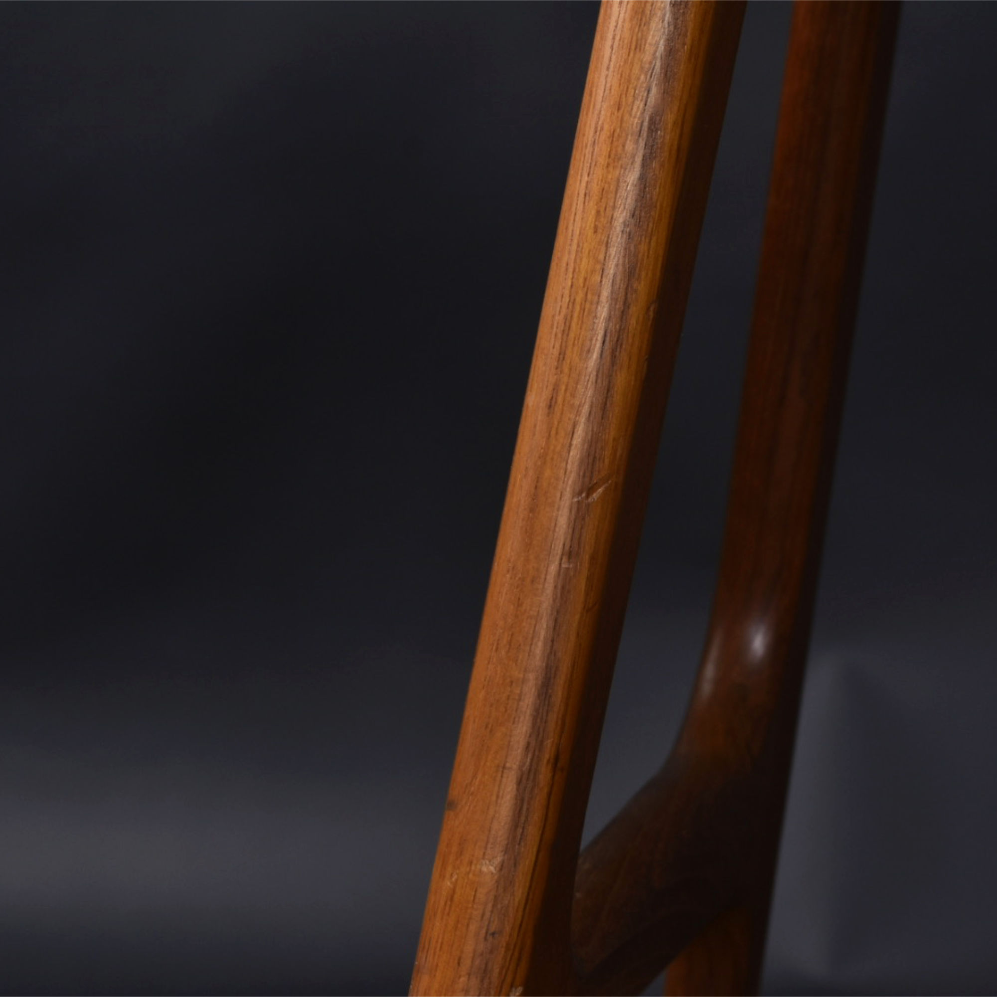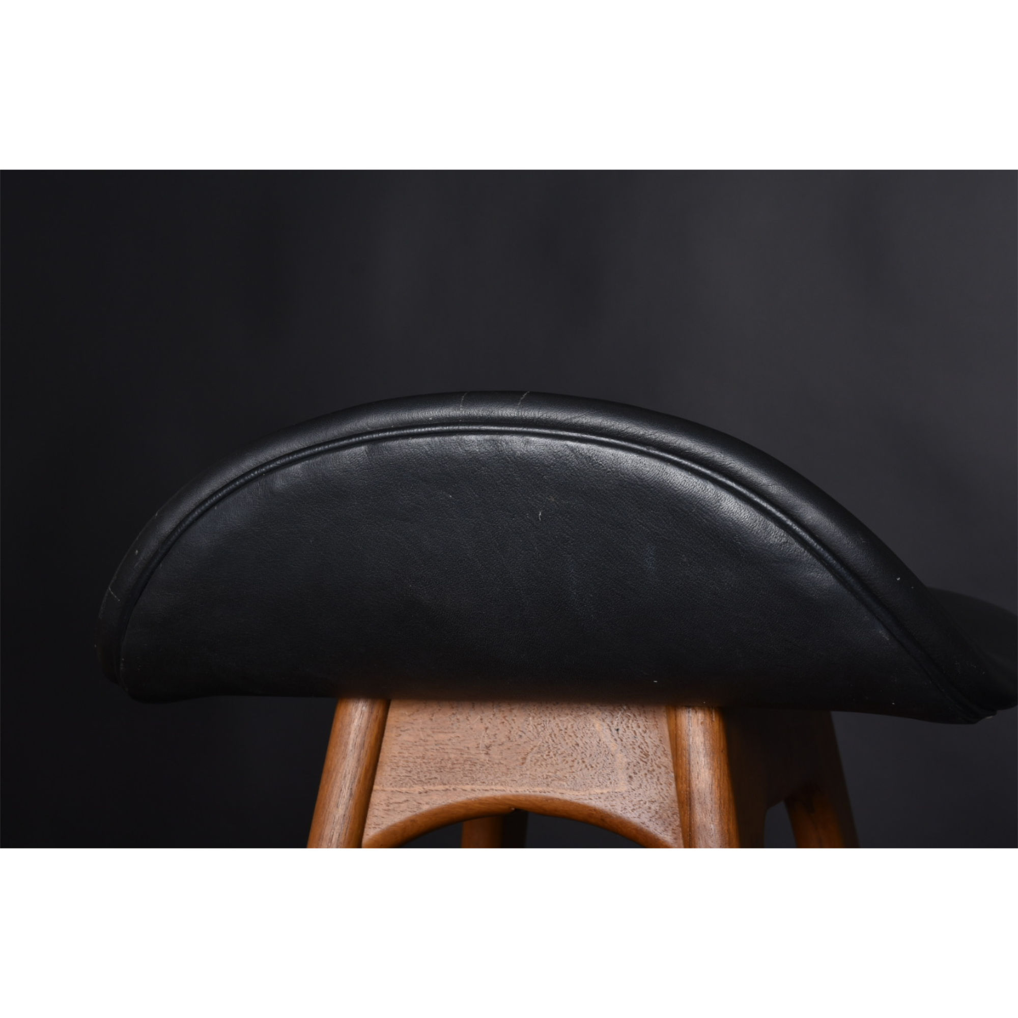 Condition: The barstools are in very good vintage condition and present nicely. Close inspection reveals flaws on the seats including scratches, nicks, and scuffs in the vinyl. There is also some light wear on the wood frame concentrated on the foot rests. The bottoms of the feet have some fading of the wood.