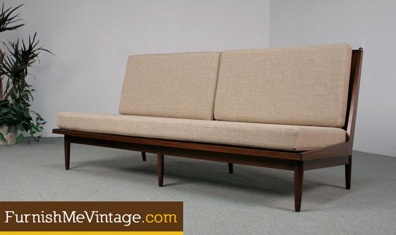 Exceptional Mid Century Modern Danish style sofa. Origin unknown, but construction and design are second to none! Subtle details achieve a profoundly refined, simple elegance. Note the sculpted angles along the side of the couch. See how the back gently arches back, meeting a gently flared seat base. Rear legs resemble extend from the sofa frame like flying buttresses in ages old European architecture. Details like this are not found on many pieces. Craftsmanship like this is evidence of superior quality. Solid walnut wood frame has deep, dark chocolate hue. Solid wood bottom supports the seat. No worries of worn support straps. Seat foam and fabric are all new. Fresh for your home ?? like having a new vintage couch.