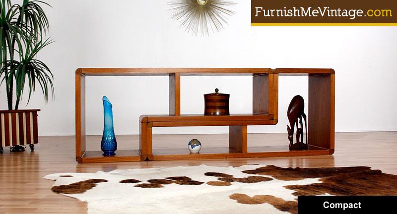 Danish Modern teak console with shelving. Versatile, expandable unit. Slide outward to expand incrementally or completely. Multifunctional piece can be used as a bookcase, entertainment center or console table. Ideal for placement beneath a flat screen TV. Consider using as a bookcase in your home office or master bedroom. Finished on the back side, can be used as a room divider in open floor plans.