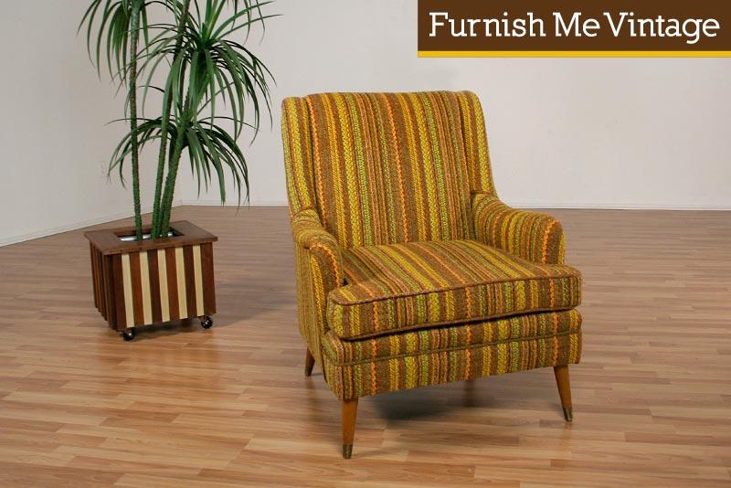 Super cool vintage fabric on this retro arm chair. Big, comfy, American style lounge chair. Flared atomic age legs. The upholstery makes this piece. Cable threaded multi-color striped fabric. Original to the piece, or at least recovered decades ago. Time capsule piece in excellent condition. Ready to take it’s place in your uber-authentic period home.