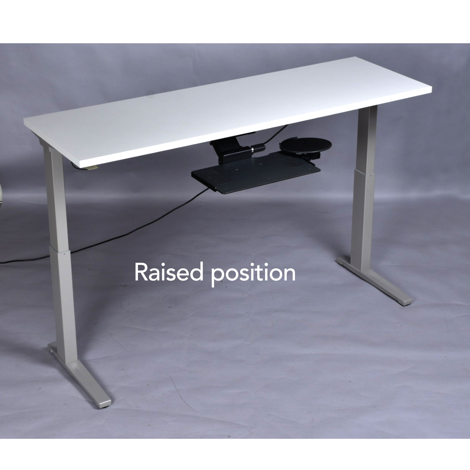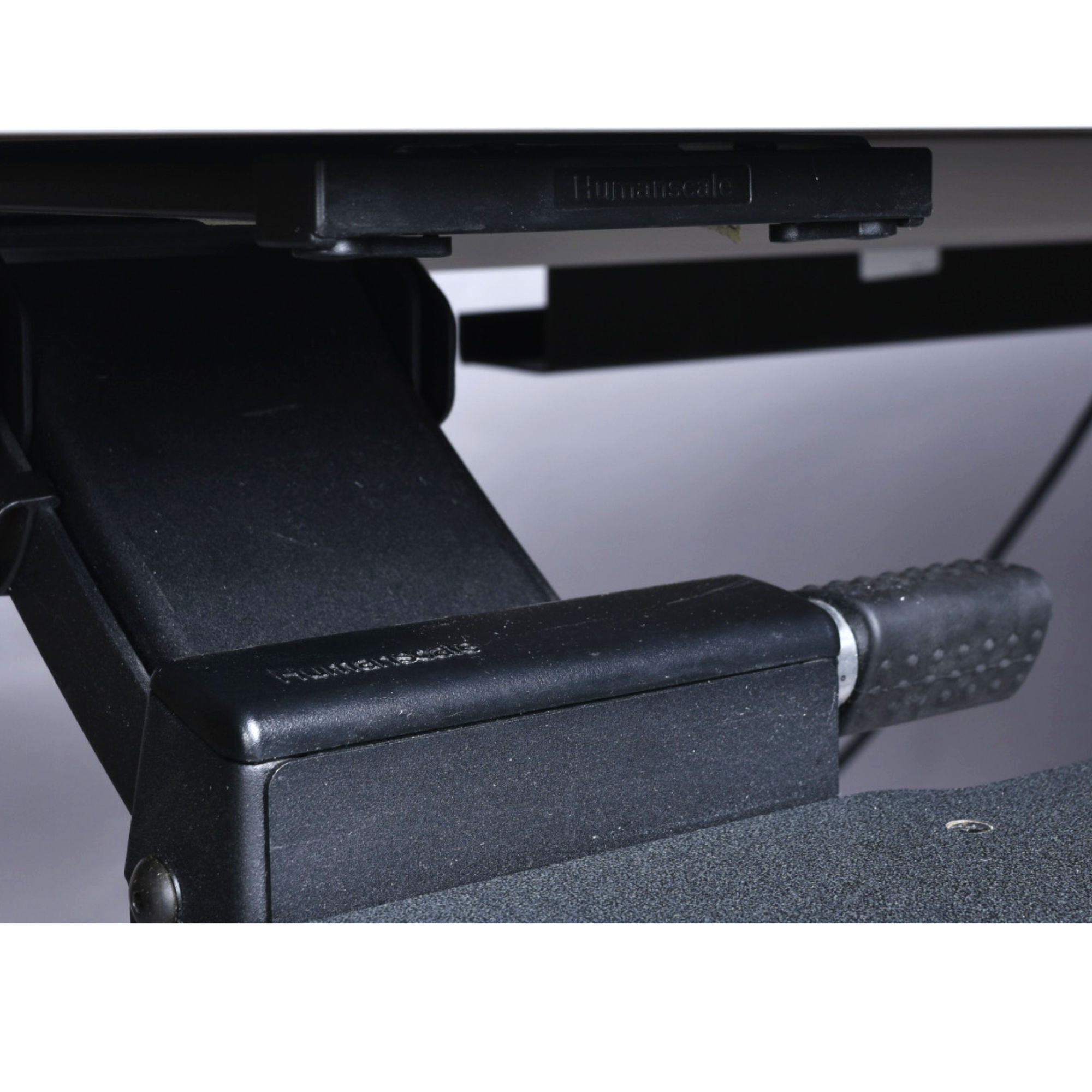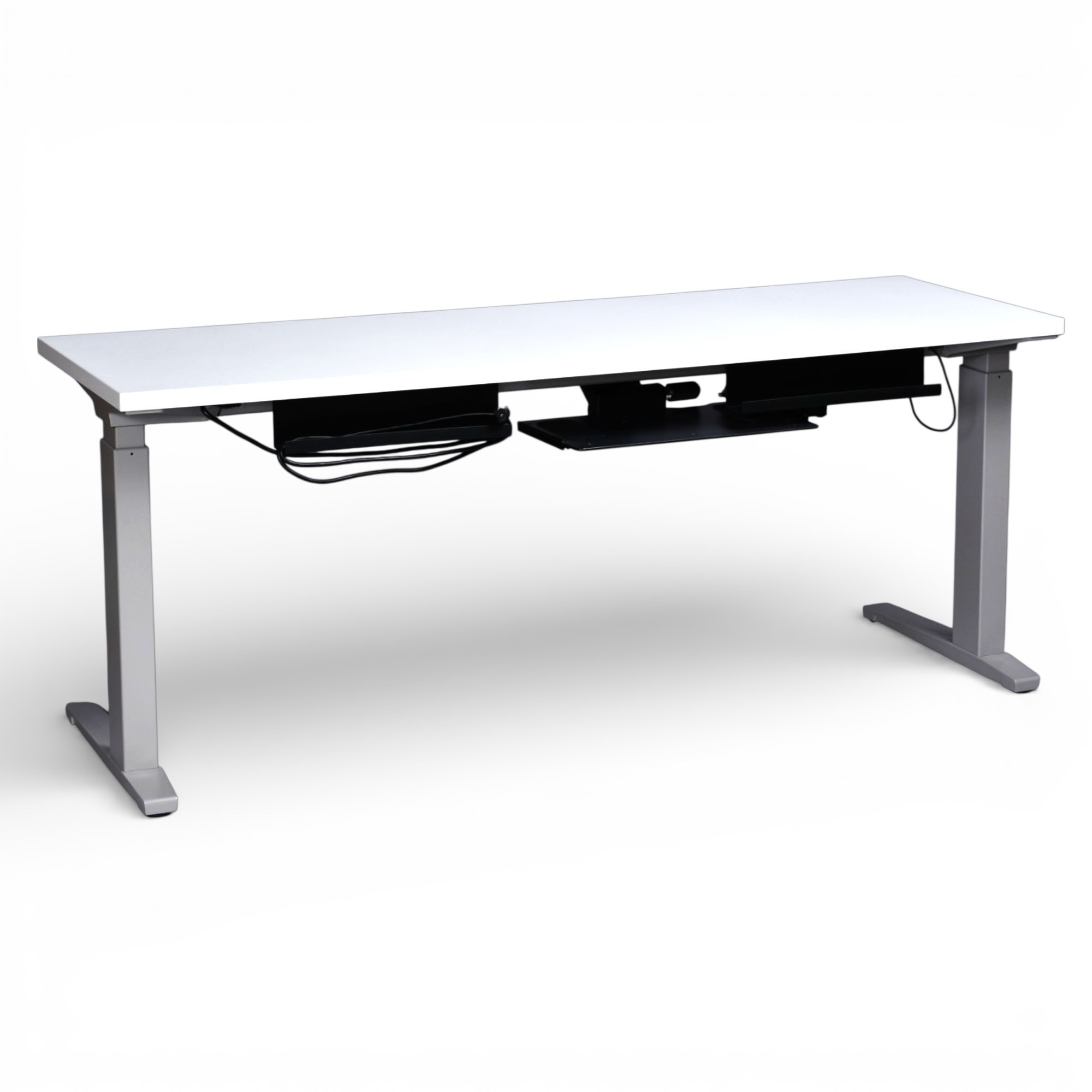 Herman Miller’s Sit-to-Stand Table encourages regular movement between postures to adjust to people’s work and workflow. The this work station is endlessly versatile. It’s 70 inches of length are ideal for creatives who need plenty of desktop area. This desk is power (electric) operated. There is a button beneath the desk top that allows one to effortlessly adjust the high between it’s lowest setting (27″) to its greatest height (45.4″). The shortest height (27″) is ideal for a typical seated position. Raise the table to adjust to your task or comfort. Relieve back and joint pressure by varying your position while you work. The sit-stand capabilities of this desk gives your spine and hips a break from being seated. This desk comes with bonus accessories. Articulating keyboard and mouse trays are situated at front. There are also brackets behind the desk to wind up loose wires from computer or other desktop electronics. The Herman Miller label and “Made in America” stickers are present. This desk is also stamped with the production year, 2018.