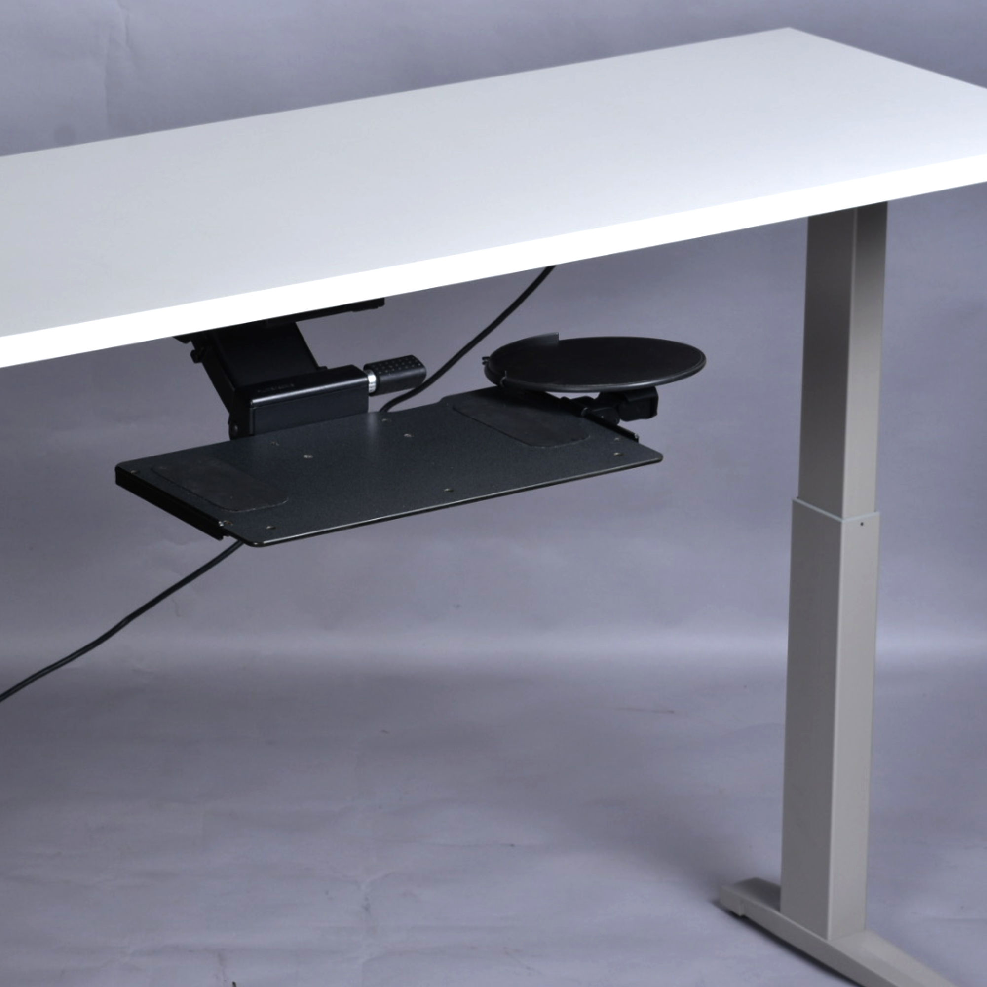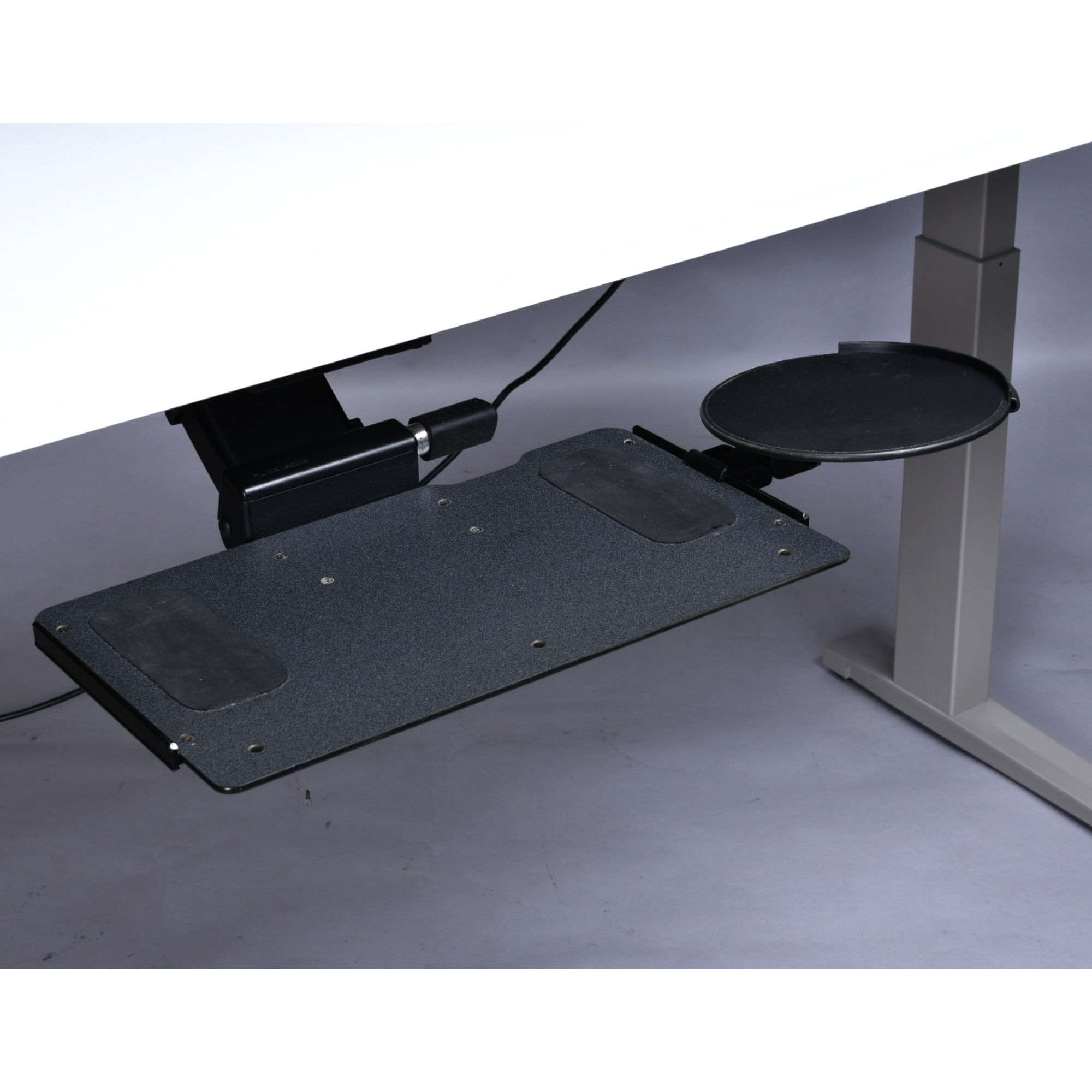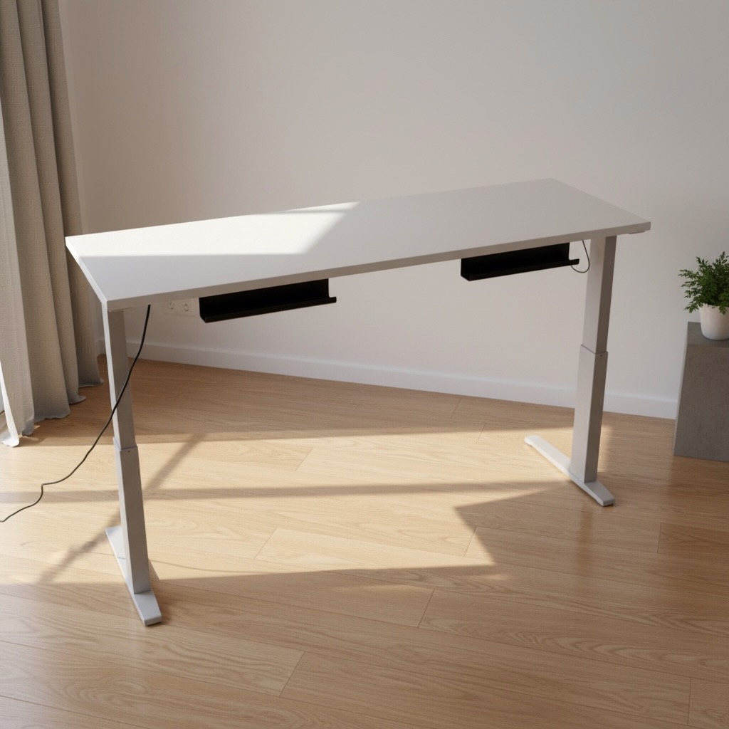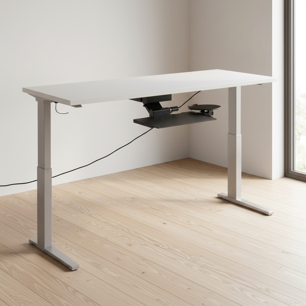 Herman Miller’s Sit-to-Stand Table encourages regular movement between postures to adjust to people’s work and workflow. The this work station is endlessly versatile. It’s 70 inches of length are ideal for creatives who need plenty of desktop area. This desk is power (electric) operated. There is a button beneath the desk top that allows one to effortlessly adjust the high between it’s lowest setting (27″) to its greatest height (45.4″). The shortest height (27″) is ideal for a typical seated position. Raise the table to adjust to your task or comfort. Relieve back and joint pressure by varying your position while you work. The sit-stand capabilities of this desk gives your spine and hips a break from being seated. This desk comes with bonus accessories. Articulating keyboard and mouse trays are situated at front. There are also brackets behind the desk to wind up loose wires from computer or other desktop electronics. The Herman Miller label and “Made in America” stickers are present. This desk is also stamped with the production year, 2018.