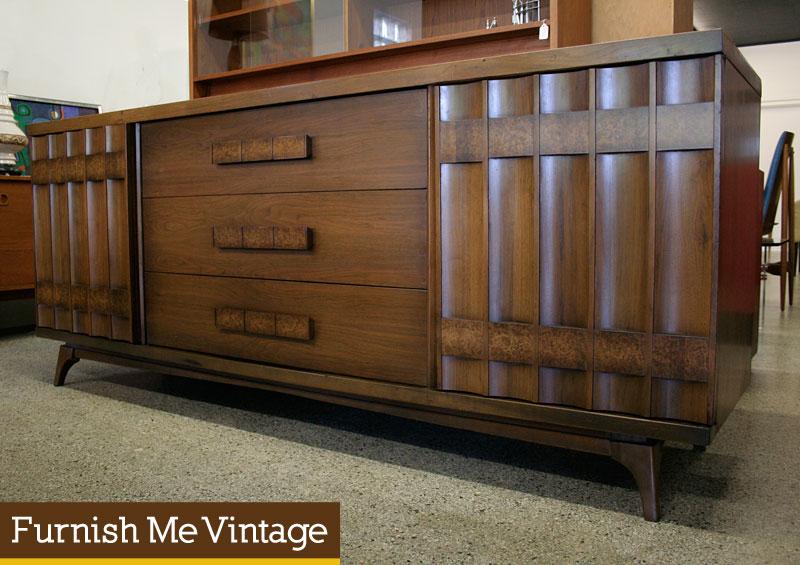 Sublimely unique HUGE vintage triple dresser credenza with sculptural, masculine form. This unit has an unmistakable retro 1950s look with a fluted ribbed front edifice accented with burlwood sculpted formations. This nine drawer dresser has tons of storage space. Cherry wood construction with three large, spacious drawers down the center flanked by two columns of three drawers on each side. Beautifully sculpted cabinet doors cover these smaller drawers. We also have a matching armoire, headboard and huge mirror (all sold separately).