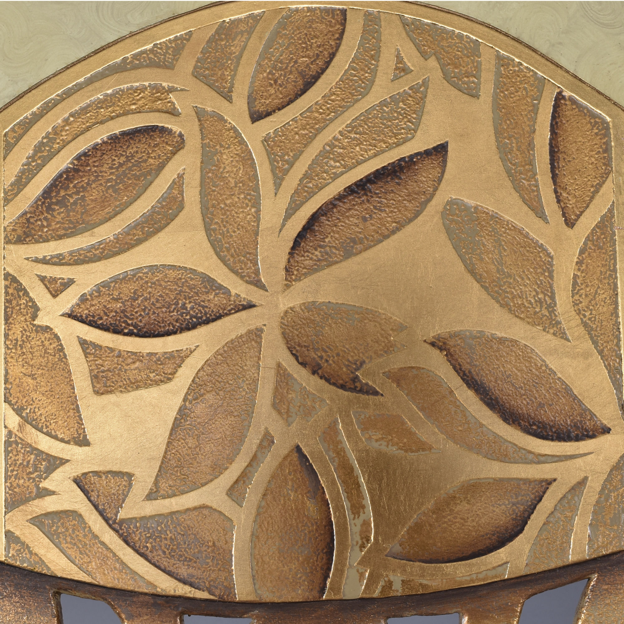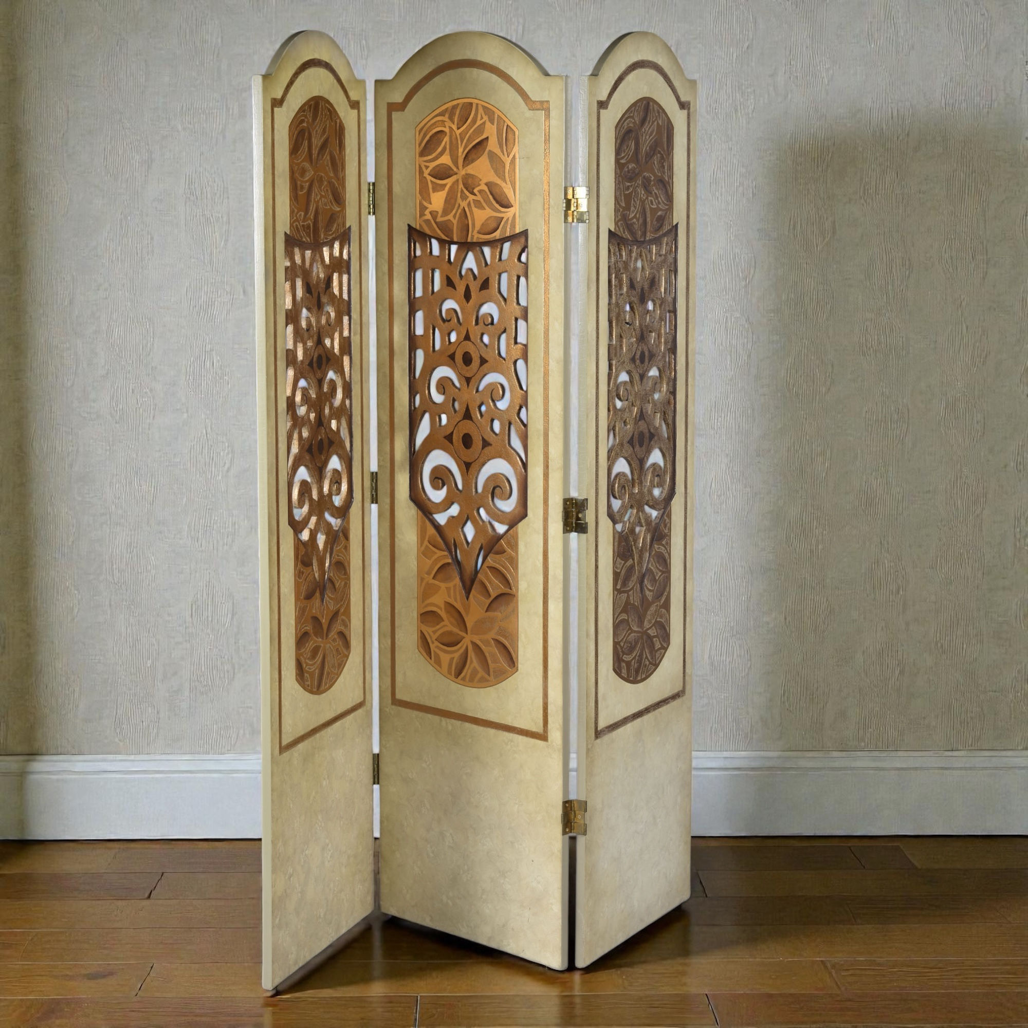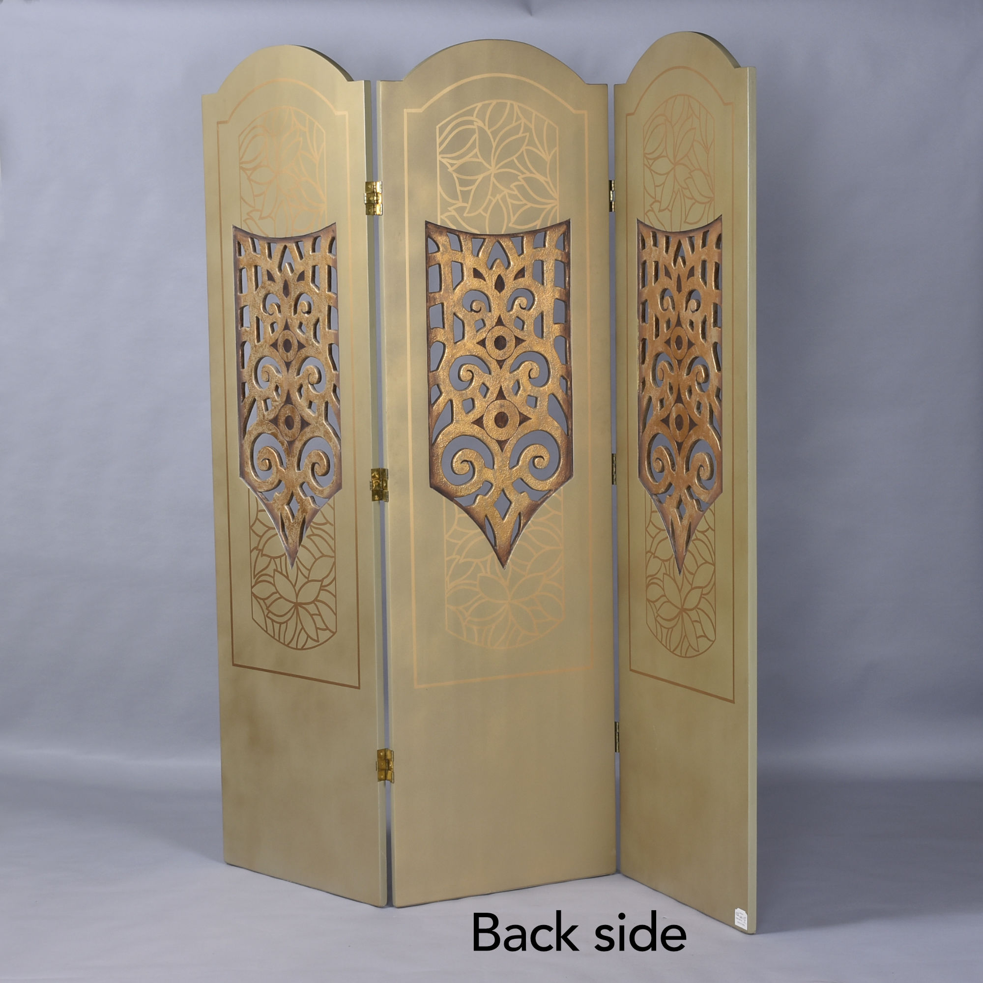 Italianate 3 panel, double-sided, folding screen by ArtMax. The room divider blends Mediterranean botanical motifs with classical revival elements. Each panel features the same design. A plume of leaves flank a mosaic of decorative scrolls. Italy’s rich architectural heritage is expressed in the arched, golden border surrounding the elegant center design. The finish is where this room divider shines… literally. The border, leaves, and lattice are all rendered in gold leaf. Light dances through the gold leaf, adding a real dynamism to the metallic surface. The depth of the gold hue changes with the shimmer of light. The cream colored background is equally detailed with faux plaster brushwork. What sets this piece apart is its fully decorated backside, ensuring visual appeal from every angle—perfect for open floor plans where both sides are on display. Whether used to define a cozy reading nook, add privacy to a studio space, or simply serve as a striking decorative accent, this folding screen offers both function and beauty.