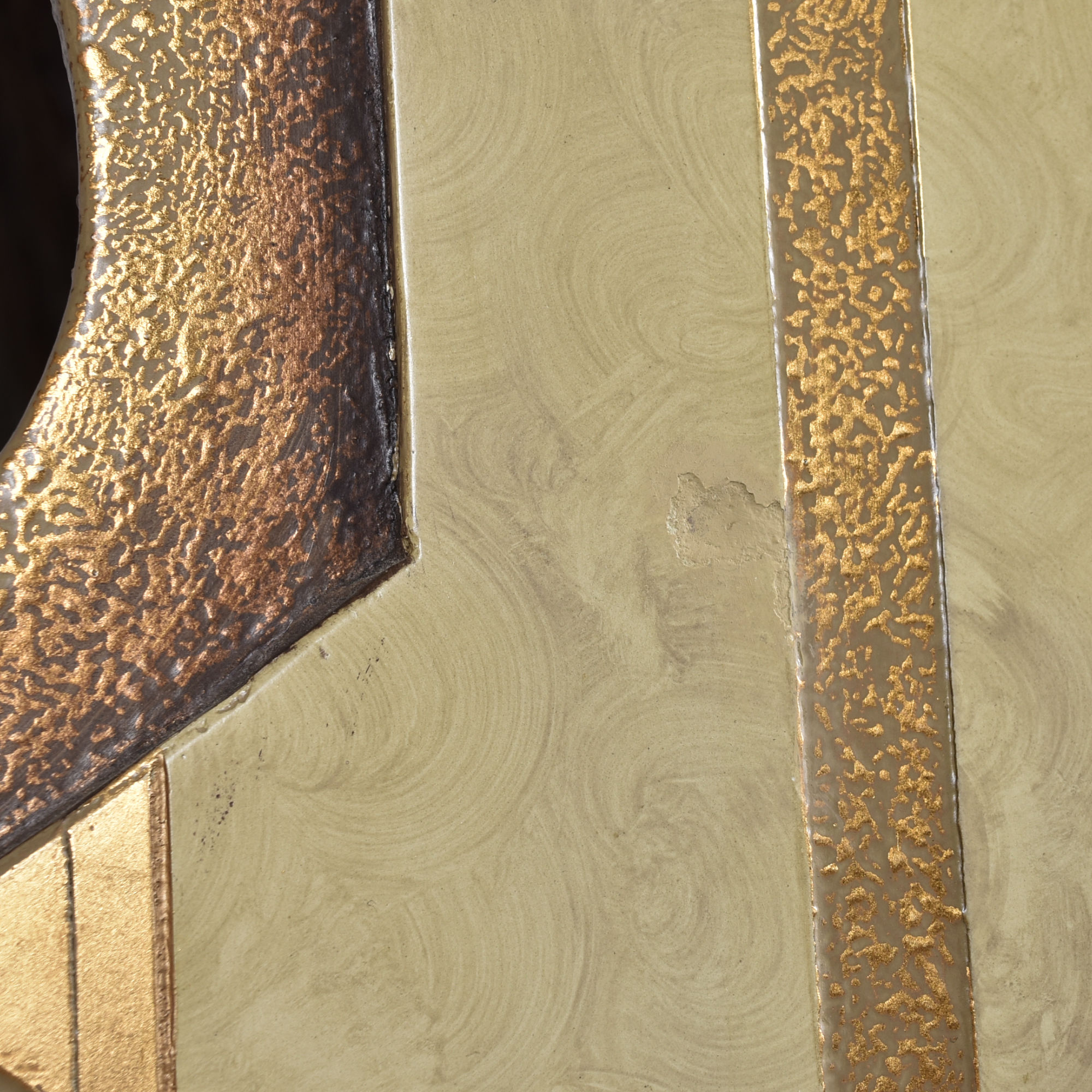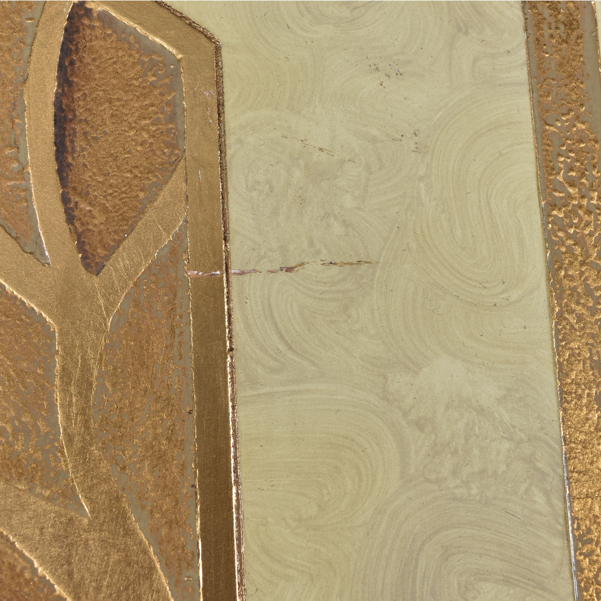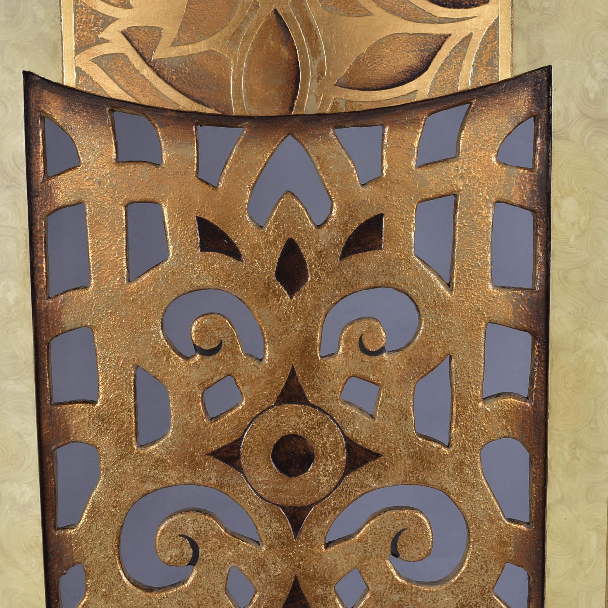 Italianate 3 panel, double-sided, folding screen by ArtMax. The room divider blends Mediterranean botanical motifs with classical revival elements. Each panel features the same design. A plume of leaves flank a mosaic of decorative scrolls. Italy’s rich architectural heritage is expressed in the arched, golden border surrounding the elegant center design. The finish is where this room divider shines… literally. The border, leaves, and lattice are all rendered in gold leaf. Light dances through the gold leaf, adding a real dynamism to the metallic surface. The depth of the gold hue changes with the shimmer of light. The cream colored background is equally detailed with faux plaster brushwork. What sets this piece apart is its fully decorated backside, ensuring visual appeal from every angle—perfect for open floor plans where both sides are on display. Whether used to define a cozy reading nook, add privacy to a studio space, or simply serve as a striking decorative accent, this folding screen offers both function and beauty.